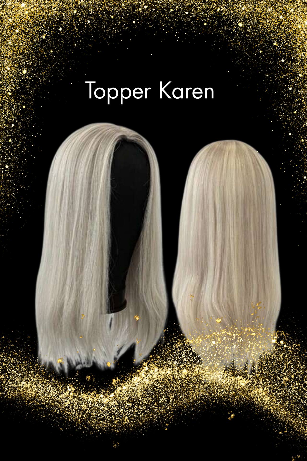 Je navržen tak, aby zakryl větší plochu hlavy a dodal vlasům bohatý objem a přirozený vzhled. Topper KAREN má rozměry základny 16,5 x 17,5 cm a je na vrchní části vpichovaný v imitaci lidské kůže.